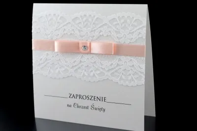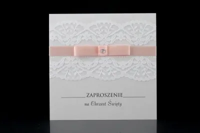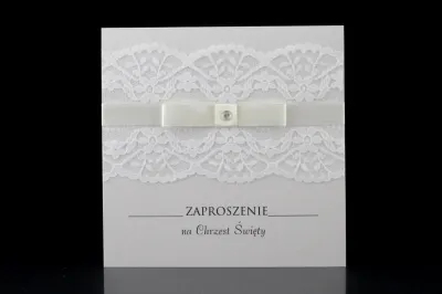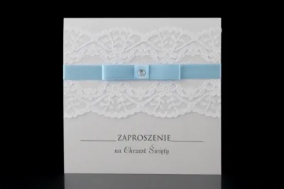 Gustowne Zaproszenia na Chrzest wykonane metalizowanego papieru w kolorze białym na którym umieszczona jest ozdobna koronka. Koronkę ozdabia wstążka - możliwość wyboru spośród 4 kolorów. Całość dopełnia ozdobny cekin.