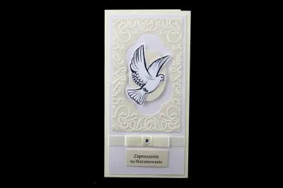 Zaproszenie na Bierzmowanie wykonane z kremowego papieru z ozdobnym tłoczeniem oraz motywem gołębia. Całość ozdabia kremowa wstążka z cekinem.