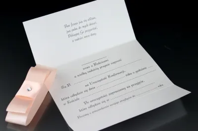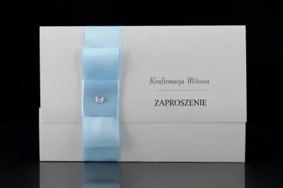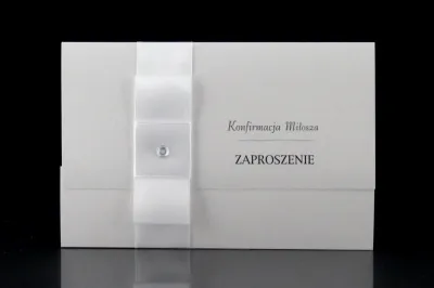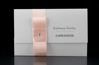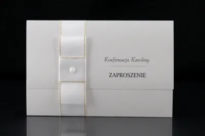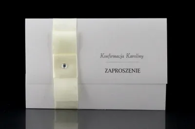 Niezwkle proste i zachwycające elegancją Zaproszenie na Konfirmację. Wymiary zaproszenia po złożenu to 9,8 cm x 14,8 cm, zaś po rozłożeniu 20,8 cm x 14,8 cm. Zaproszenie składane na "3". Wykonane metalizowanego białego papieru o gramaturze 250gm2. Zaproszenie przepasane jest pionowo wstążką - różową, niebieską, białą, biało-złotą lub kremową. Na wstążce umieszczony jest ozdobny cekin lub perełka. Zaproszenie otwiera się "do góry". Sama treść zaproszenia może być dowolna, także treść wierszyka.