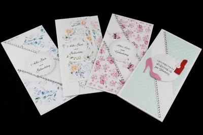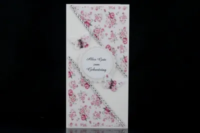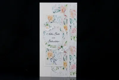 Kartki okolicznościowe urodzinowe po niemiecku w formacie DL. Rozmiar kartki to 10,5cm x 21cm.