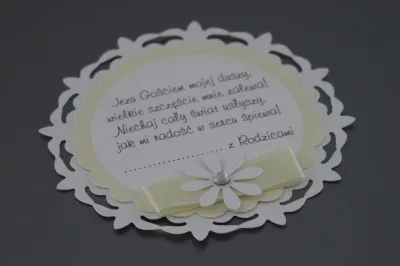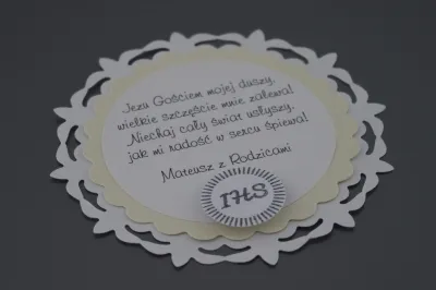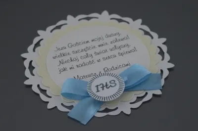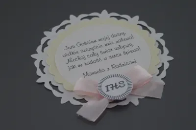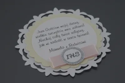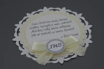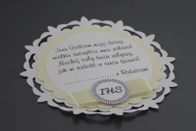 Etykieta na ciasto komunijne w okrągłym formacie o średnicy 10,3cm. Wyjątkowy wygląd i styl. Wykonana z 3 warstw papieru, białego, kremowego oraz na wierzchu ponownie z białego. Etykieta ozdobiona wstążką w zależności od wybranej wersji w kolorze różowym, kremowym lub niebieskim. Dodatkową ozdobą jest znak IHS lub kwiatem. Całość wykonana niezwykle estetycznie i gustownie.