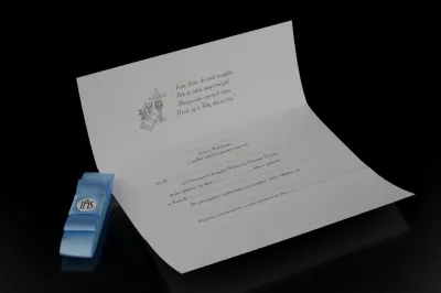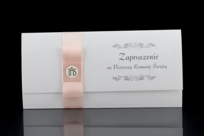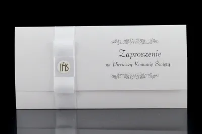 Zaproszenia Komunijne wykonane z białego papieru z ozdobną wstążką i symbolem IHS. Wymiary zaproszeń po złożeniu: 21 cm x 10 cm. Po rozłożeniu 21cm x 29,7cm.