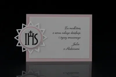 Etykiety na ciasto komunijne wykonane są z wysokiej jakości materiałów. Etykieta składa się z 2 wartw papieru, na której umieszczony jest motyw hostii w monstrancji. Wymiar etykiety 8 cm x 11 cm. Do wyboru papier kremowy, różowy lub niebieski.