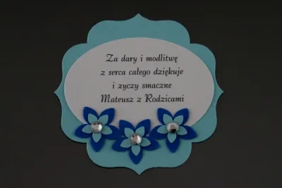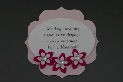 Gustowna etykieta na ciasto komunijne, która składa się z 2 wartw papieru. Etykieta przyozdobiona delikatnymi kwiatuszkami.