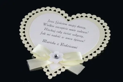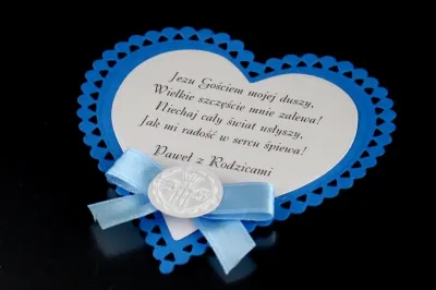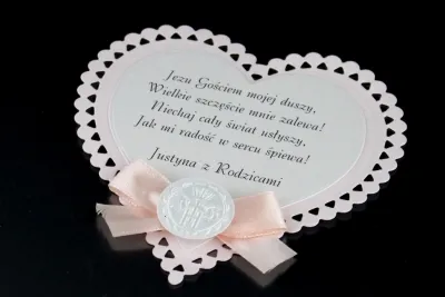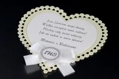 Etykiety wykonane są z wysokiej jakości materiałów. Format serca o wymiarach 10 cm x 10 cm. Do wyboru papier kremowy, różowy lub niebieski. Etykiety na ciasto komunijne niezwykle eleganckie i przyciągające wzrok.
