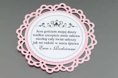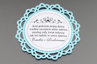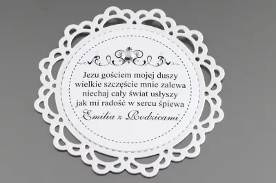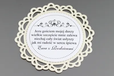 Elegancka etykieta na ciasto komunijne, wykonana w okrągłym kształcie. Składa się z 2 wartw papieru. Średnica etykiety to 91 mm. Dolna warstwa posiada ażurowy ozdobny wzór oraz wykonana jest w zależności od wersji z papieru białego, kremowego, różowego lub niebieskiego.