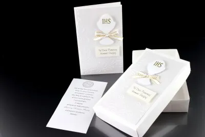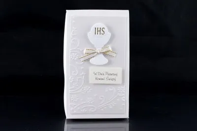 Pamiętka Pierwszej Komunii Świętej w formie pudełka. W środku pudełka znajduje się kartka przyozdobiona jak front pudełka oraz kartka z życzeniami.