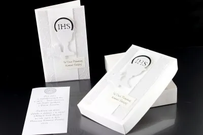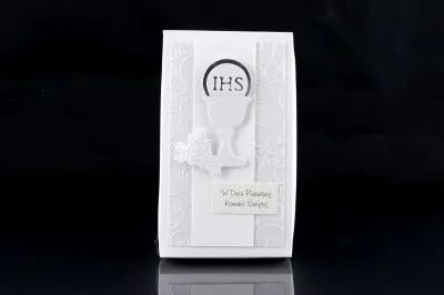 Pamiętka Pierwszej Komunii Świętej w formie pudełka. W środku pudełka znajduje się kartka przyozdobiona jak front pudełka oraz kartka z życzeniami.