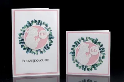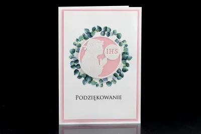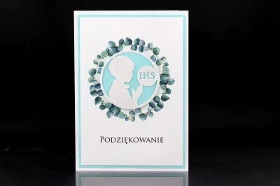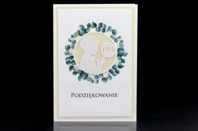 Podziękowanie Komunijne o wielkości 20,8 cm x 14,5 cm. W środku podziękowania znajduje się po prawej stronie właściwa treść podziękowania, z kolei po lewej stronie do wyboru: wierszyk lub kieszonka na umieszczenie zdjęcia.