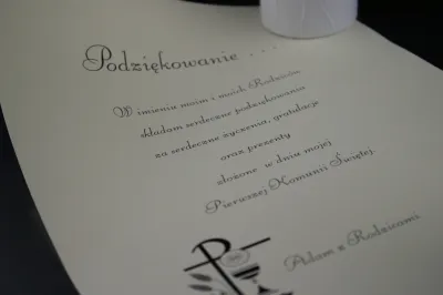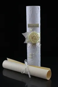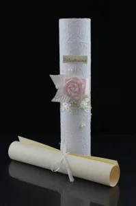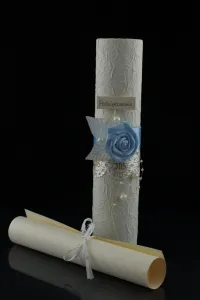 Podziękowanie Komunijne w formie tuby. W środku tuby znajduje się związana ozdobna kartka z podziękowaniem. Rozmiar tuby to 25 cm; średnica 5,5 cm. Treść podziękowania może być dowolna.
