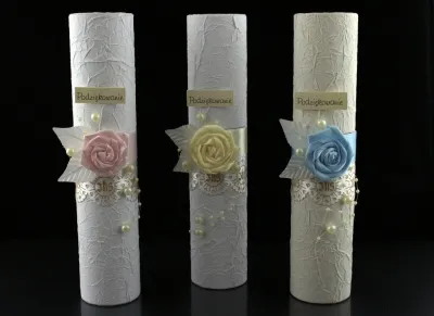 Tuba dostępna w kolorze białym oraz kremowym. Umieszczona na tubie wstążka z kwiatkiem może być różowa, niebieska, biała, kremowa.