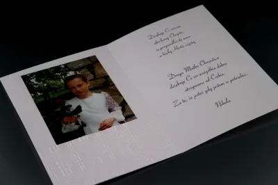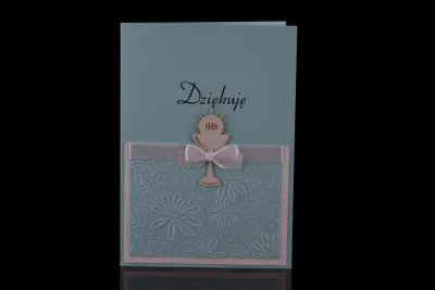Podziękowanie Komunijne o wielkości 20,8 cm x 14,5 cm. W środku podziękowania znajduje się tekst oraz miejsce na włożenie zdjęcia.