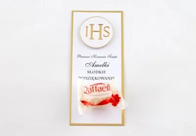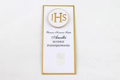 Podziękowanie komunijne z miejscem na czekoladkę o wymiarach 15,5 cm x 7cm. Wykonane z 2 warstwa papieru, od dołu złotego, od góry białego. Całość ozdabia symbol IHS. Na podziękowaniu przyklejone są kawałki tasmy dwustronnej. Wystarczy odkleić górną wartwę i przykleić czekoladkę.