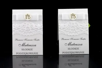 Stojące Podziękowanie Komunijne - Słodkie Podziękowania. Wymiary po złożeniu 10x6,5x4 cm. W środku znajduje się miejsce na 2 cukierki, podklejone tasmą dwustronną. Podziękowanie wysyłamy przygotowane do złożenia - wystarczy odkleić taśmę dwustronną i skleić.