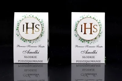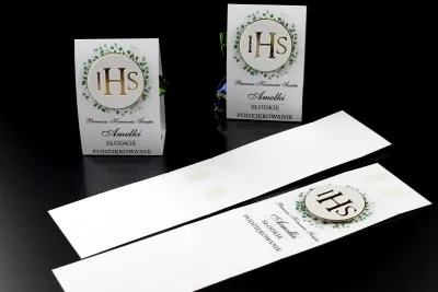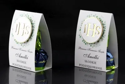 Stojące Podziękowanie Komunijne - Słodkie Podziękowania. Wymiary po złożeniu 10x6,5x4 cm. W środku znajduje się miejsce na 2 cukierki, podklejone tasmą dwustronną. Podziękowanie wysyłamy przygotowane do złożenia - wystarczy odkleić taśmę dwustronną i skleić.