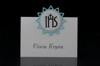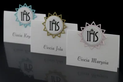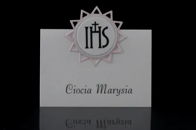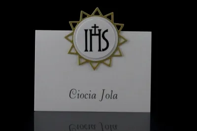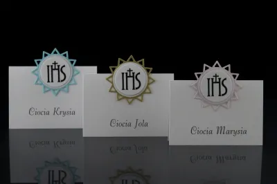 Winietka na stoł z okazji przyjęcia komunijnego. Łączy w sobie funkcję ozdobną oraz organizacyjną. Na przednej stronie umieszczone jak imię i nazwisko gościaRozmiar to 2 x 10 cm x 7 cm. Wysokiej jakości papier wizytówkowy.