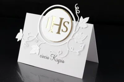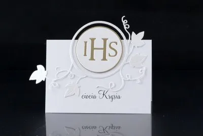 Winietka na stoł z okazji przyjęcia komunijnego. Łączy w sobie funkcję ozdobną oraz organizacyjną. Na przednej stronie umieszczone jak imię i nazwisko gościaRozmiar to 2 x 10 cm x 7 cm (bez części wystających). Wysokiej jakości biały papier.