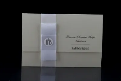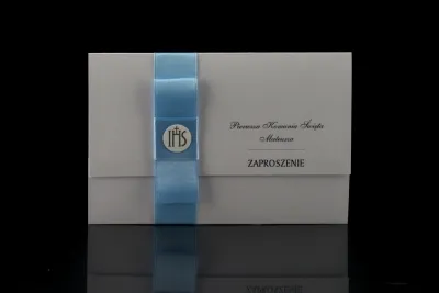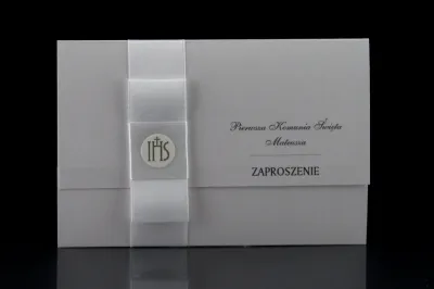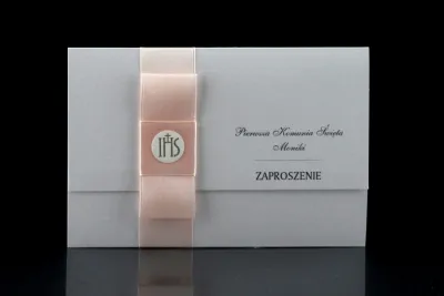 Niezwkle proste i zachycające elegancją Zaproszenie Komunijne. Wymiary zaproszenia po złożenu to 9,8 cm x 14,8 cm, zaś po rozłożeniu 20,8 cm x 14,8 cm. Zaproszenie składane na "3". Wykonane białego lub kremowego papieru o gramaturze 250gm2. Zaproszenie przepasane jest pionowo wstążką - różową, niebieską, białą lub kremową. Na wstążce umieszczony jest ozdobny motyw IHS. Zaproszenie otwiera się "do góry". Sama treść zaproszenia może być dowolna.