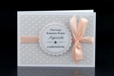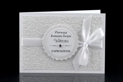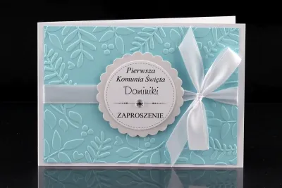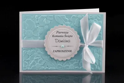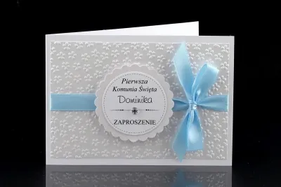 Proste i eleganckie Zaproszenie Komunijne. Wymiary zaproszenia po złożenu to 10,4 cm x 14,8 cm, Zaproszenie otwierane do boku. Wykonane z białego papieru o gramaturze 250gm2 przyozdobione tłoczeniem oraz wstążką - w zależności od wersji: białą, różową lub niebieską oraz cekinem.Do wyboru 5 rodzajów tłoczeń, 3 kolory wstążki, 3 kolory papieru ozdobnego oraz kolor cekinu/perełki.