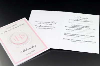 Zaproszenie Komunijne otwierane do do boku w 3 różnych wersjach kolorystycznych. Wymiary tego zaproszenia na komunię to 10,4 cm x 14,8 cm. Wykonane z 3 warstw papieru, na którym umieszczony jest ozdobny wzór oraz symbol IHS w kształcie hostii. Całość uzupełnia tekst "Zaproszenie na Pierwszę Komunię Świętą" wraz imieniem dziecka i datą uroczystości.