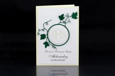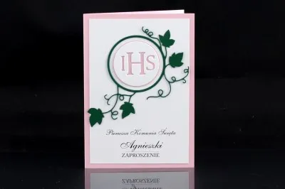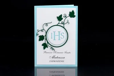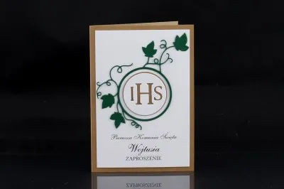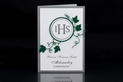 Zaproszenie na Komunię otwierane do do boku w 5 różnych wersjach kolorystycznych. Wymiary tego zaproszenia komunijnego to 10,4 cm x 14,8 cm. Wykonane z 2 warstw papieru, na którym umieszczony jest ozdobny wzór kwiatowy oraz symbol IHS w kształcie hostii. Całość uzupełnia w dolnej cześci zaproszenia tekst "Pierwsza Komunia Święta ZAPROSZENIE" wraz imieniem dziecka i datą uroczystości. Do wyboru jest także wersja wykonana na papierze eko oraz z papieru szarego w prążki.