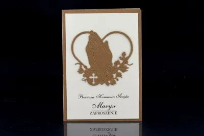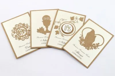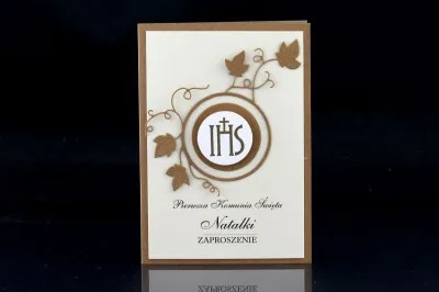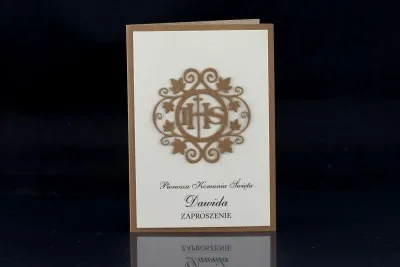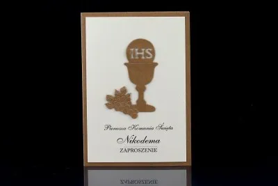 Zaproszenie na Komunię otwierane do do boku w 4 różnych wersjach. Wykonane z papieru eco oraz papieru metalizowanego w kolorze kremowym. Wymiary tego zaproszenia komunijnego to 10,4 cm x 14,8 cm. Wykonane z 2 warstw papieru, na którym umieszczony jest ozdobny wzór do wyboru w 4 różnych motywach. Całość uzupełnia w dolnej cześci zaproszenia tekst "Pierwsza Komunia Święta ZAPROSZENIE" wraz imieniem dziecka.