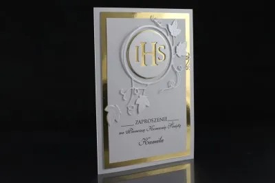 Elegankie i urzekające Zaproszenia Komunijne wykonane z 3 warstw białego i złotego papieru. Zaproszenie w formacie prostokątnym pionowym. Ozdobione symbolem IHS na ornamencie. Zaproszenia otwierane do boku. W środku znajduje się właściwa treść zaproszenia oraz wierszyk na w lewej stronie.