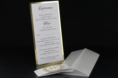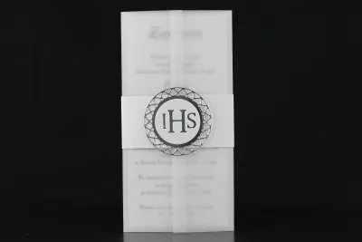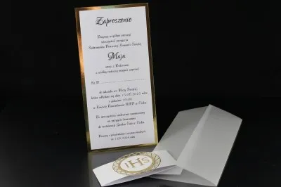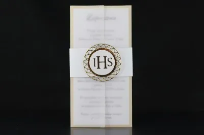 Zaproszenia Komunijne wykonane z dwóch warstw papieru, złotej lub srebrnej i białej. Zaproszenia umieszone jest w eleganckiej kalce. Całość przepasana jest białym papierem z motywem IHS.