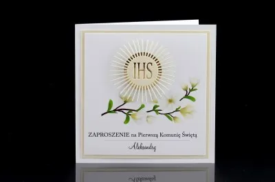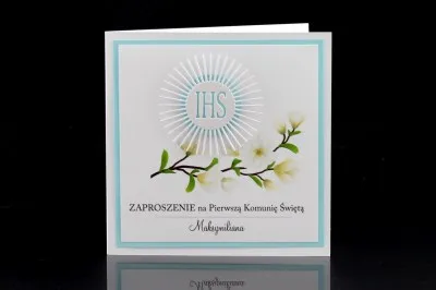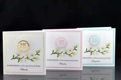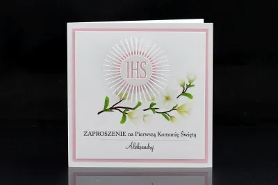 Nowoczesne Zaproszenia na Komunię - HIT 2022 roku. Zaproszenie w formie kwadratu. Wykonane łącznie z 3 warstw papieru. Ozdobione motywem kwitnącej gałązki oraz symbolem IHS z promieniami. Całość dopełniają w zależności od wybranej wersji ramka kremowa, różowa lub niebieska.