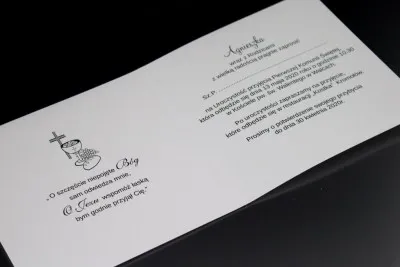 Zaproszenia otwierane do boku. W środku zaproszenia znajduje się właściwa treść zaproszenia oraz wierszyk po lewej stronie.
