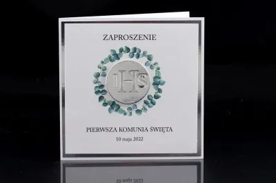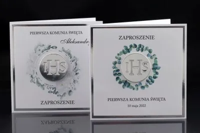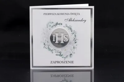 Elegankie Zaproszenia Komunijne wykonane łącznie z 3 warstw białego i srebrnego papieru. Ozdobione srebrnym symbolem IHS oraz kolorowym nadrukiem dookoła tegoż symbolu. Zaproszenia otwierane do boku. W środku zaproszenia znajduje się właściwa treść zaproszenia oraz wierszyk po lewej stronie.