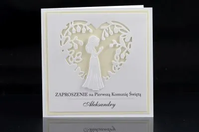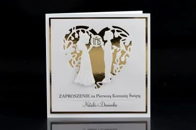 Elegankie Zaproszenia Komunijne w formie kwadratu. wykonane łącznie z 3 warstw białego papieru. Ozdobione kolorowym papierem oraz ozdobnym, wyciętym sercem. Na tym w zależnosci od wersji naklejona jest postać dziewczynki, chłopca lub dziewczynki i chłopca.