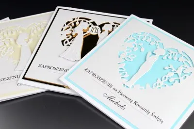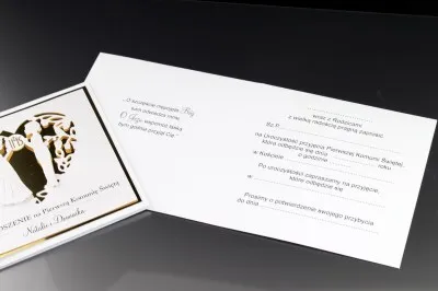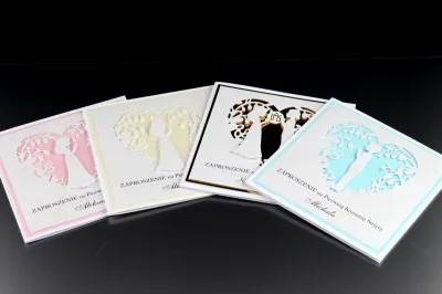 Zaproszenia otwierane do boku. W środku zaproszenia znajduje się właściwa treść zaproszenia oraz wierszyk po lewej stronie.