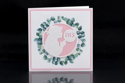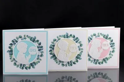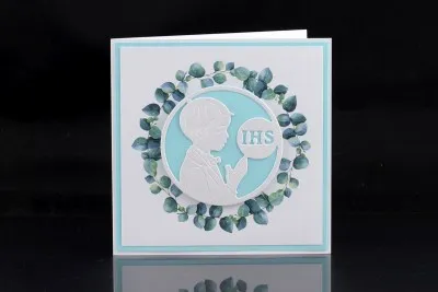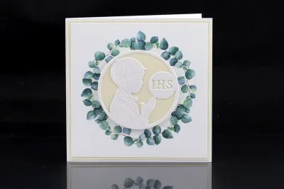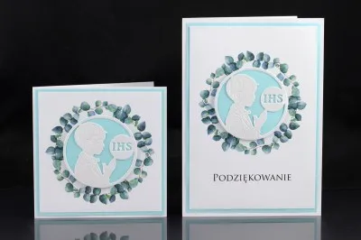 Elegankie i nowoczesne Zaproszenia Komunijne w formie kwadratu. Wykonane łącznie z 3 warstw białego papieru. Ozdobione motywem eukaliptusa oraz kolorowym wyciętym motywem chłopca lub dziewczynki.