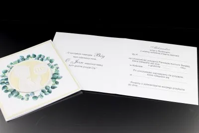 Zaproszenia otwierane do boku. W środku zaproszenia znajduje się właściwa treść zaproszenia oraz wierszyk po lewej stronie.