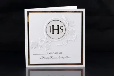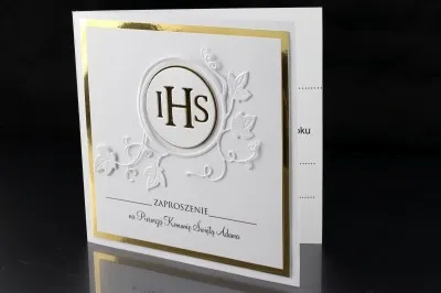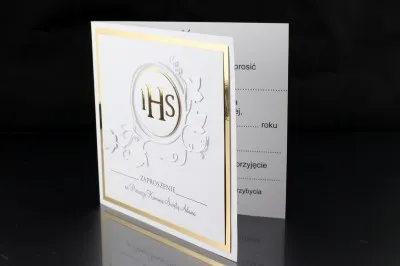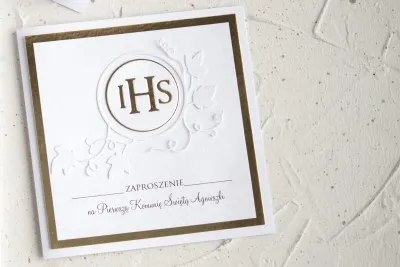 Elegankie Zaproszenia Komunijne wykonane z 3 warstw białego i złotego papieru. HIT 2025. Ozdobione symbolem IHS na ornamencie. Zaproszenia otwierane do boku. W środku zaproszenia znajduje się właściwa treść zaproszenia oraz wierszyk po lewej stronie.