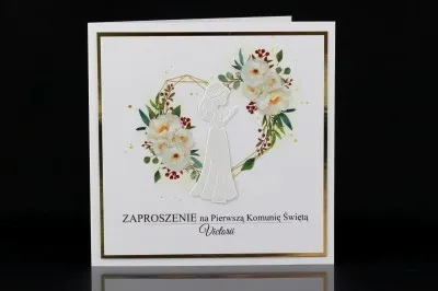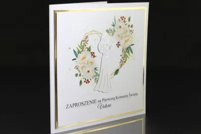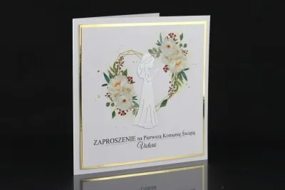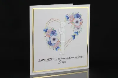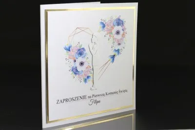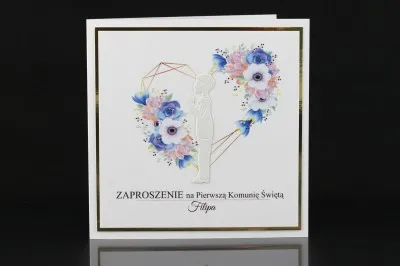 Bardzo elegankie Zaproszenia Komunijne w wersji dla chłopca lub dziewczynki. Zaproszenia wykonane z 3 warstw papieru, dolna i górna z białego papieru, natomiast środkowa ramka z papieru złote lustro. W centralnej cześci znajduje się w zależności od wersji postać chłopca lub dziewczynki, zaś dookoła postaci motyw kwiatowy w kształcie serca. Zaproszenia otwierane do boku. W środku zaproszenia znajduje się właściwa treść zaproszenia oraz wierszyk po lewej stronie.