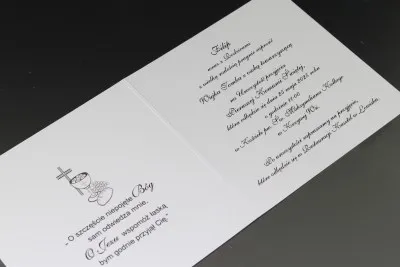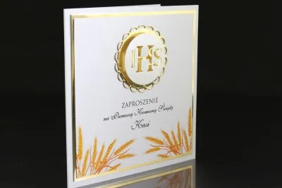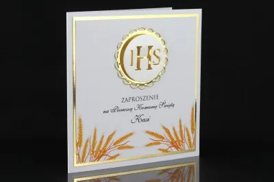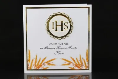 Zaproszenia Komunijne z motywem graficznym źdźbła zboża. Zaproszenia wykonane z 3 warstw papieru, dolna i górna z białego papieru, środkowa zaś ramka z papieru złote lustro. W centralnej cześci znajduje się motyw IHS. Na dole znajduje się gafika przedstawiająca źdźbła zbóż. Zaproszenia otwierane do boku. W środku zaproszenia znajduje się właściwa treść zaproszenia oraz wierszyk po lewej stronie.