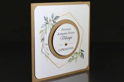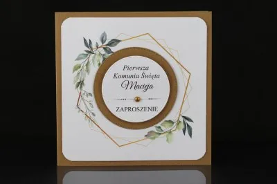 Eleganckie Zaproszenia Komunijne wykonane z papieru eco. W centralnej cześci znajduje się motyw kwiatowy. W jego środku w kole znajduje sie mniejsze białe koło z motywem z napisami.