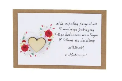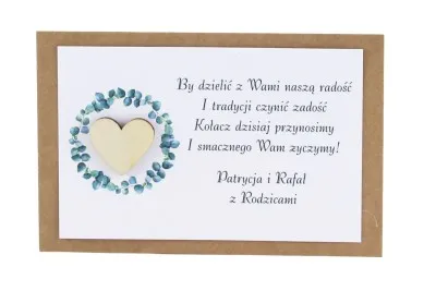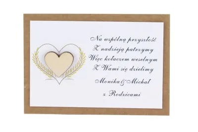 Etykiety na ciasto w formie prostokąta o wymiarach 9 cm x 6 cm. Wykonana z papieru eko, białego papieru na którym jest umieszczony ozdobny motym kwiatowy oraz serce ze sklejki.