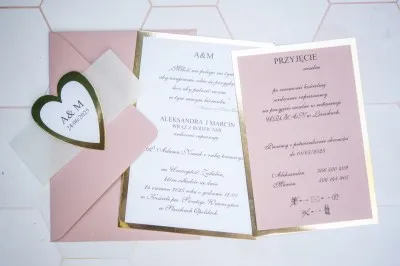 Zaproszenie prostokątne o wymiarach 16,5x11,5 cm wykonane z papieru złotego Mirror 220g, białego 250g i pudrowego różowego, ekologicznego 300 g. Zaproszenie złożone jest z dwóch części i obwoluty wykonanej z kalki z serduszkiem. W środku serduszka można napisać inicjały lub imiona Pary Młodej, datę ślubu lub sam wyraz Zaproszenie. Do zaproszenie dołączona jest koperta w kolorze pudrowy róż.