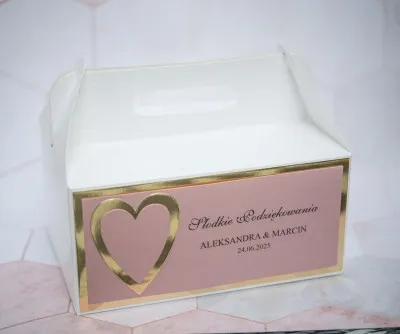 Pudełko z naszej oferty wykonane jest z różowego papieru ekologicznego 300g z czarnym nadrukiem wraz z imionami Państwa Młodych i datą uroczystości. Całość ozdabia złota ramka z papieru Mirror 220g.
