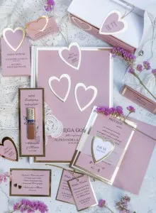 Przepiękna kolekcja papeterii ślubnej w kolorze pudrowego różu oraz złota. W jej skład wchodzi: