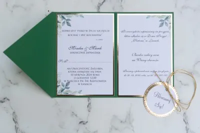 Zaproszenie w kształcie koperty, przewiązane złotą gumką z zawieszką, na której można umieścić imiona i datę ślubu lub własny tekst. Zaproszenie wykonane jest z zielonego, nakrapianego, papieru 220 g. Wymiary po złożeniu 10.5x14,7. W środku treść zaproszenia wydrukowana jest na białym papierze 250g i przyklejona na złoty papier lustrzany. Cytat i kwiatowe grafiki można zmienić według sugestii Młodej Pary.