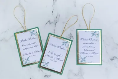 Zawieszka na alkohol wykonana jest z zielonego papieru metalizowanego 220g w połączeniu z papierem złotym lustrzanym o tej samej gramaturze. Rozmiar zawieszki uzależniony jest od ilości tekstu. Zawieszka wykończona jest złotym sznurkiem. Para Młoda ma możliwość wyboru wierszyków.