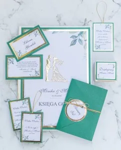 Wyjątkowo ładna kolekcja papeterii ślubnej wykonana z zielonego, nakrapianego, papieru jako baza, ozdobiona złotym odbijającym papierem lustro. W jej skład wchodzi: