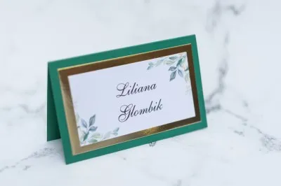 Winietka wykonana z papieru butelkowa zielń 220g w rozmiarze 10,5x7 cm i ozdobiona złotym papierem Mirror 220g.