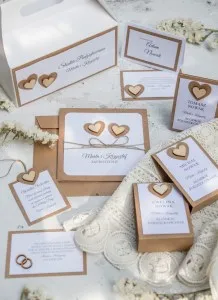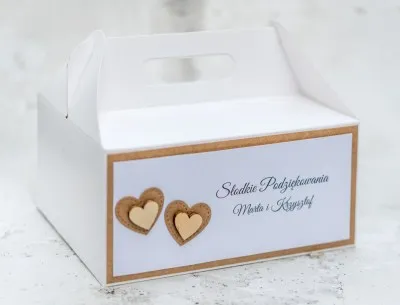 Pudełko z naszej oferty wykonane jest z białego kartonu z czarnym nadrukiem wraz z imionami Państwa Młodych i datą uroczystości. Ekologiczny papier, z którego wykonana jest ramka oraz serca ze sklejki sprawiają, że pudełko idealnie pasuje do uroczystości w stylu rustykalnym lub boho a Gościom będzie bardzo miło, jeśli otrzymają po uroczystości słodki upominek.
