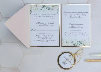 Wyjątkowa kolekcja papeterii ślubnej wykonana z jasnoróżowego papieru jako baza, ozdobiona złotym odbijającym papierem lustro - Mirror. W jej skład wchodzi: