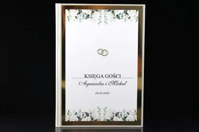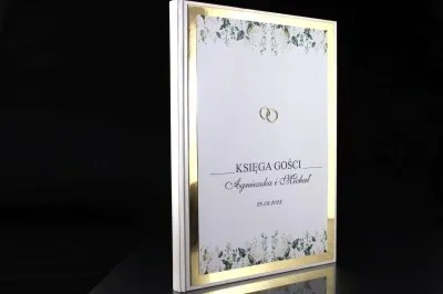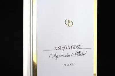 Przepiękna Księga Gości Weselnych w formiacie A4 ozdobiona papierem złotym lustro. Księga Ślubna wykonana jest z wysokiej jakości materiałów i dodaktów. Księga posiada 32 kartki, co z gwarantuje iż wystarczy miejsca na wszystkie wpisy Waszych gości weselnych. Kartki wewnątrz księgi są grube - posiadają gramaturę 180 g/m.